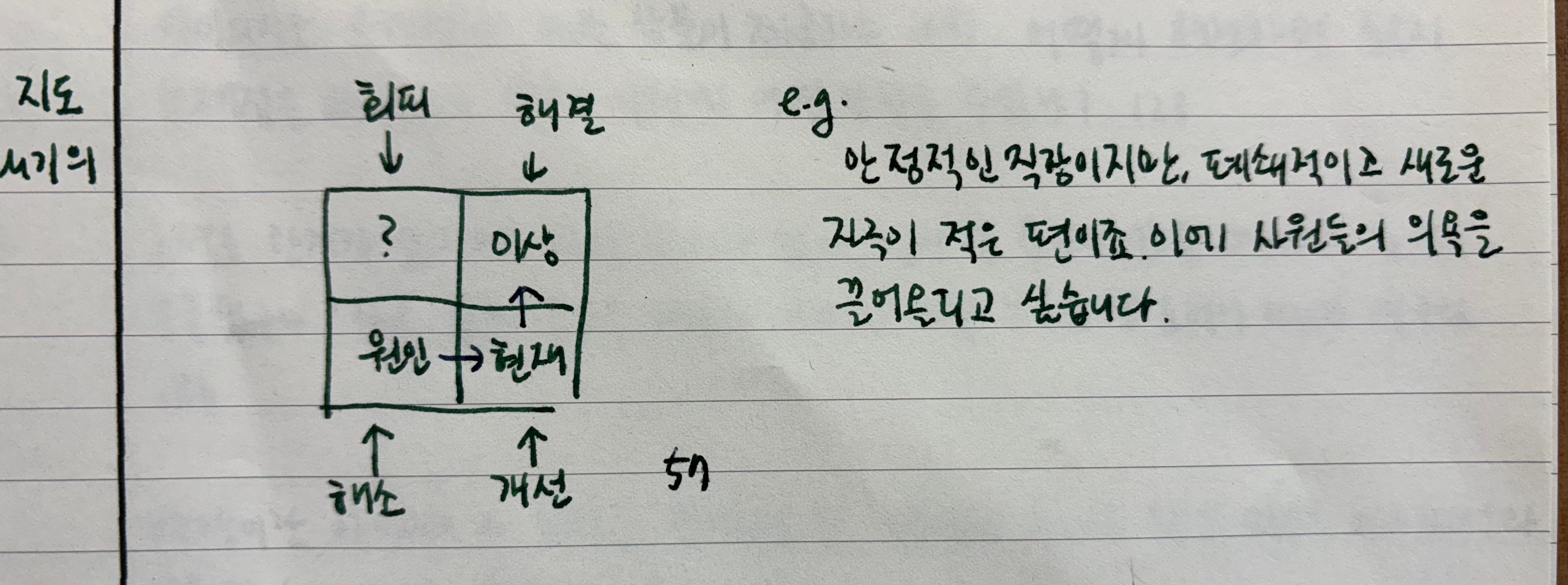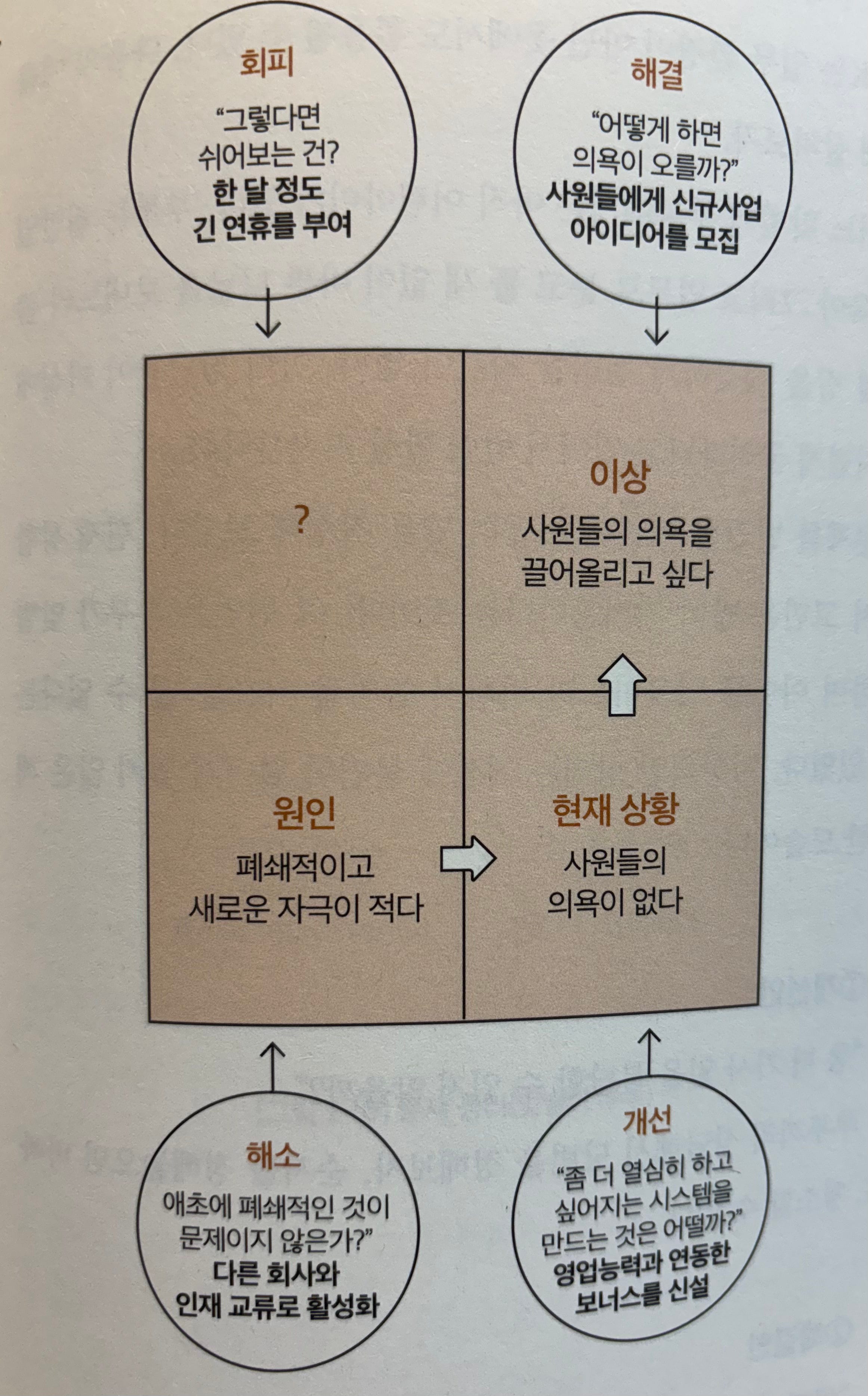먼저 문제를 원인, 현재(문제), 이상으로 분석해요. 위 예시로 보면 문제 상황은 ‘사원들의 의욕이 없다’, 원인은 ‘폐쇄적이고 자극이 적다’, 이상은 ‘의욕을 끌어올리고 싶다’입니다. ‘해소’는 원인을 없애는 방안, ‘개선’은 현재에 집중하는 방안, ‘해결’은 이상을 실현하는 방안이에요. ‘회피’는 이 중 어느 것에도 해당하지 않는, 생뚱맞은 방안이고요. 아래 예시를 볼까요?