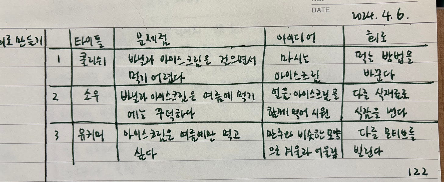 이 표는 기존의 기획을 분석하는 도구예요. 이 표를 만든 사람은 새로운 아이스크림 상품을 기획해야 하는 상황이었을 거예요. 기존에 출시된 상품을 표와 같이 분석한 거죠. ‘쿨리쉬’라는 제품을 보고 이 제품이 겨냥한 문제점이 무엇이고 그에 대한 아이디어가 무엇인지 적어요. 그다음 이 아이디어의 발상을 한 마디로 요약해요. 이렇게 발상의 회로를 여러 가지 찾은 다음, 어떤 상품을 새롭게 기획해야 할 때, 연구를 통해서 찾은 문제들에 회로들을 적용해 보는 거예요. 그러면 이전에 생각하지 못한 아이디어가 나오는 거죠.