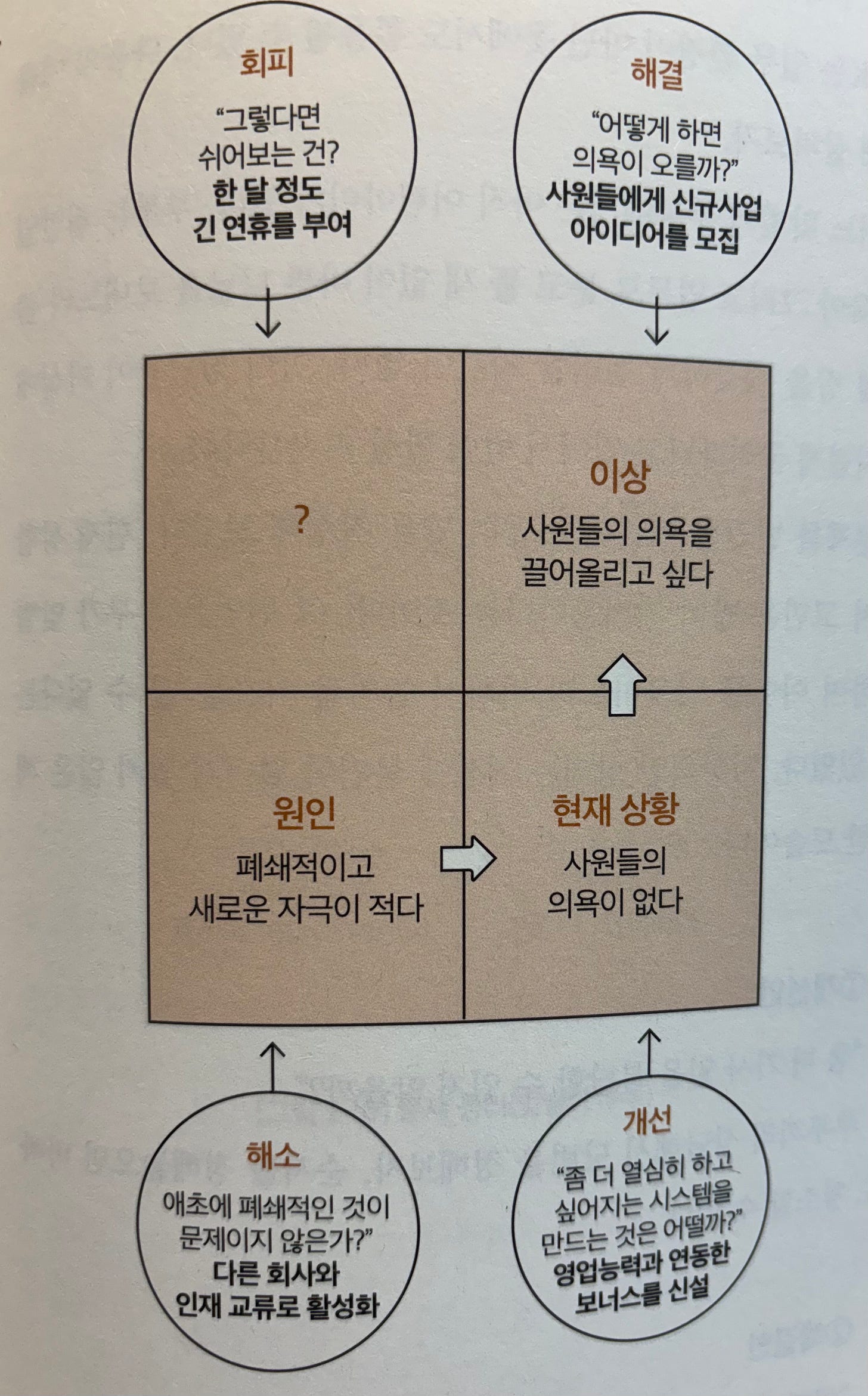 저자가 말하는 ‘아이디어’는 문제를 해결하는 방안이에요. 예를 들어 이런 문제가 있다고 해 보죠. “안정적인 직장이지만, 폐쇄적이고 새로운 자극이 적은 편이죠. 이에 사원들의 의욕을 끌어올리고 싶습니다.”(65쪽)