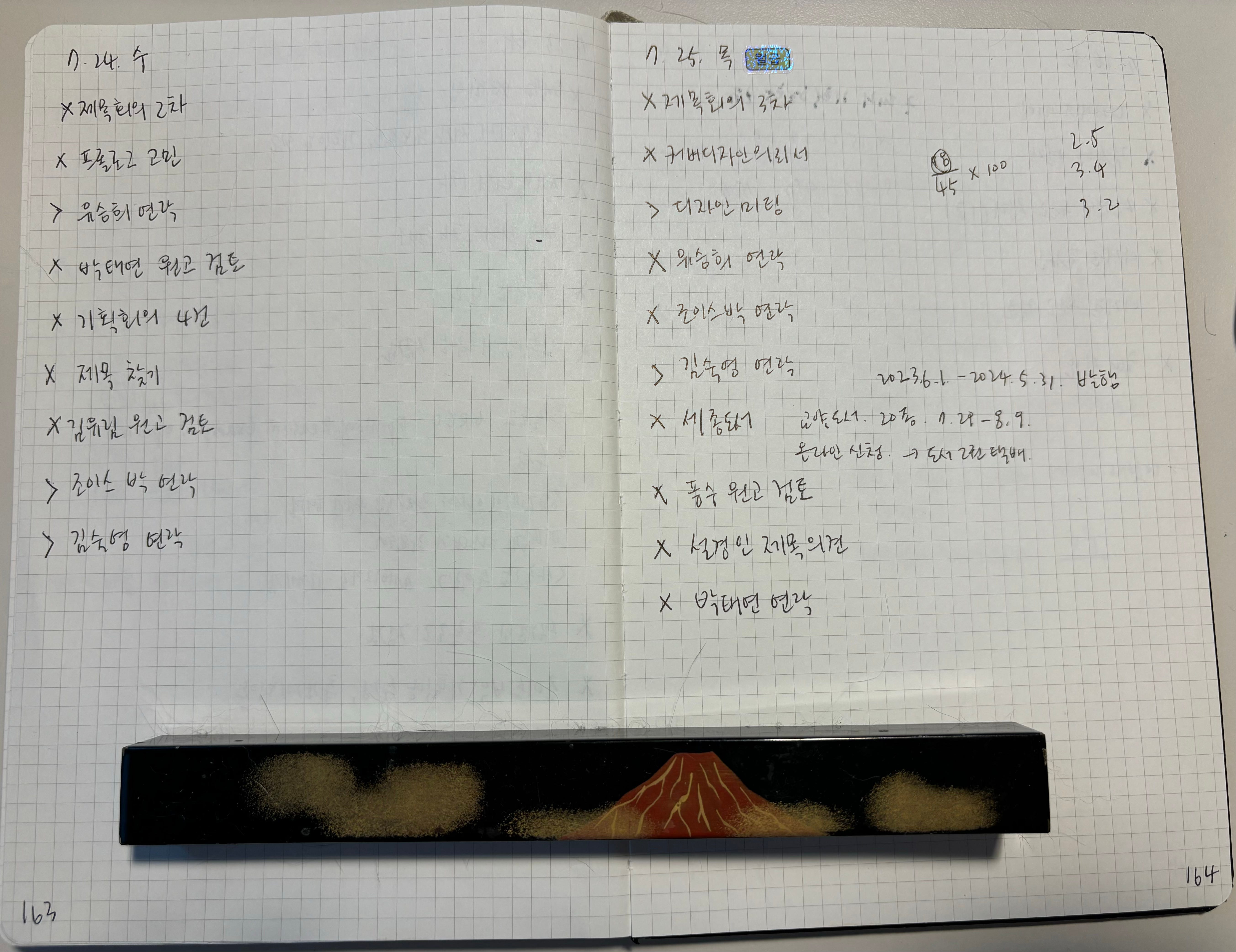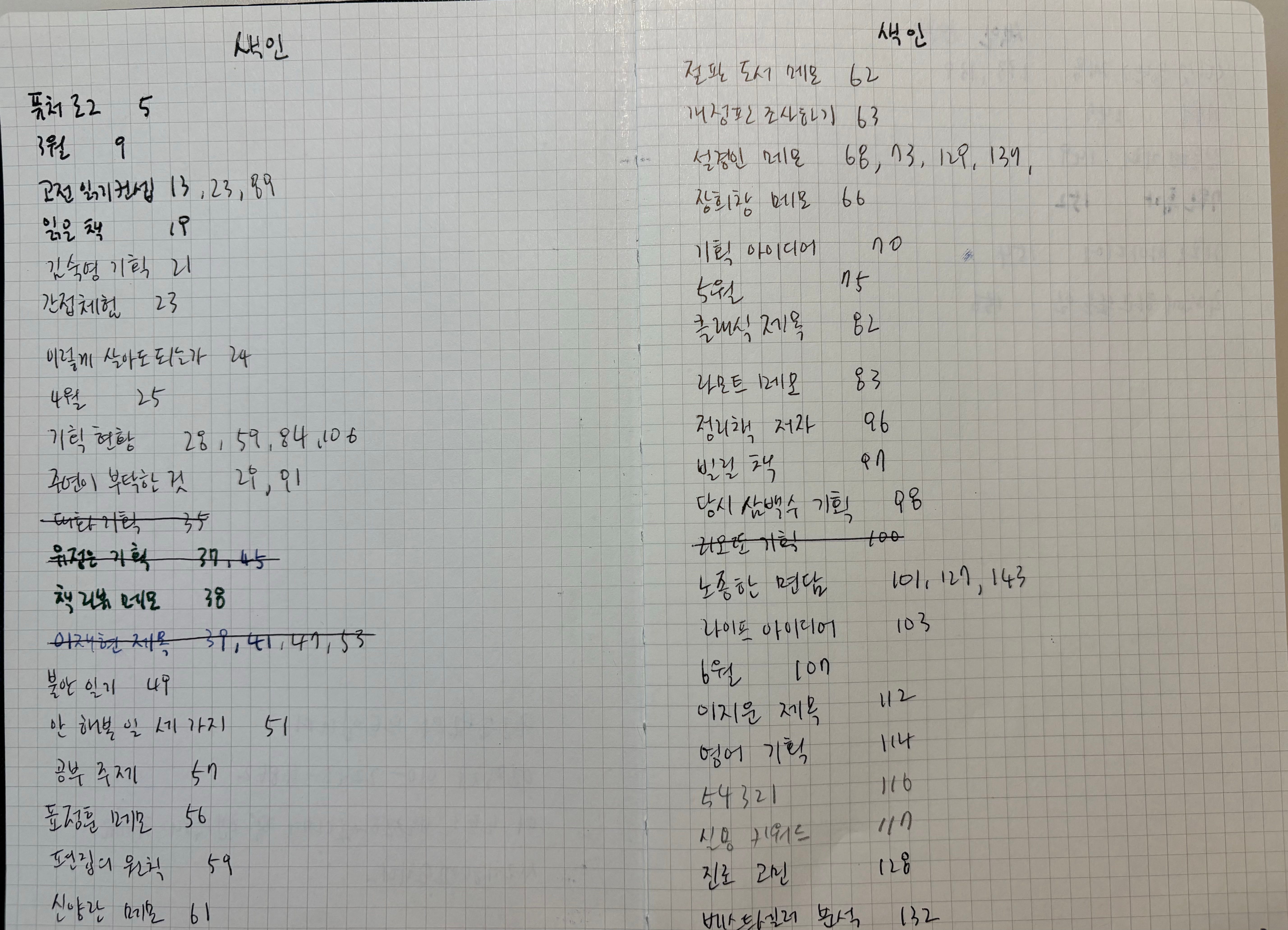 이 사진은 저널 맨 앞의 색인 부분입니다. 제가 적은 메모의 위치를 기입한 곳이에요. ‘예전에 적은 메모가 어디 있더라?’ 싶을 때, 색인을 확인하면 됩니다. 이미 적은 메모에 새 메모를 연결하고 싶을 때, 해당 항목에 쪽 위치를 추가하면 되고요.